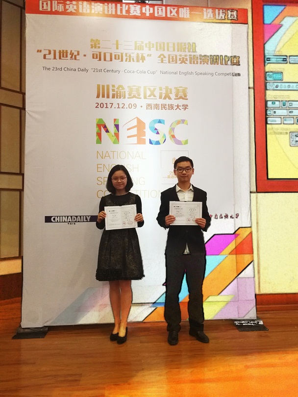 12月9日,第23届中国日报社“21世纪杯•可口可乐杯”全国英语演讲比赛川渝赛区决赛在西南民族大学(航空港校区)举行。威廉希尔2017级英语系陈靖怡同学和2016级动物科技学院郭一帆同学在威廉希尔贺英老师和虞跃老师的指导下,分别获得一等奖、三等奖。
