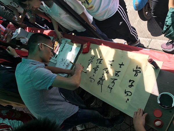 活动期间正值课后高峰期,许多同学闻声而至,且活动的参与方式也十分简单,因而吸引了不少同学的积极参与。参与者只需从纸箱中抽取问题纸条,在思考后做出回答即可。工作人员则根据答题者的正确率为其发放相应的小礼物,如毛笔、笛子、糖果等。此外,活动还邀请了几名善于书法的同学,为答题正确率高的同学现场题字。浓浓的墨香为活动增添了不少人文气息,活动现场气氛高涨。