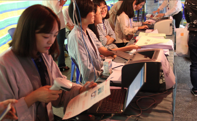 早上七点,工作人员们便早早地等候在报到点。第一位人文学子的到来拉开了本次迎新工作的帷幕。身着汉服的工作人员井然有序地为新来的同学完成一系列前期报到工作,耐心地为他们讲解报到步骤,并安排学院志愿者带领新生进行接下来的流程。
