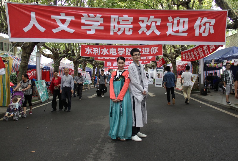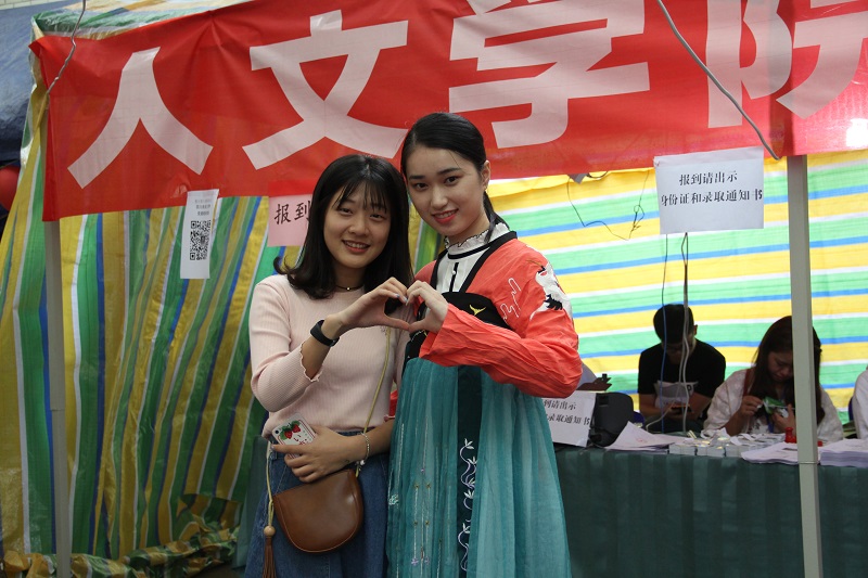 下午,工作人员们走出迎新点,在梧桐大道上与新生亲切合影,身着汉服的他们用自己的笑容与热情,为新生展现汉服魅力,彰显出人文特色,体现人文情怀。