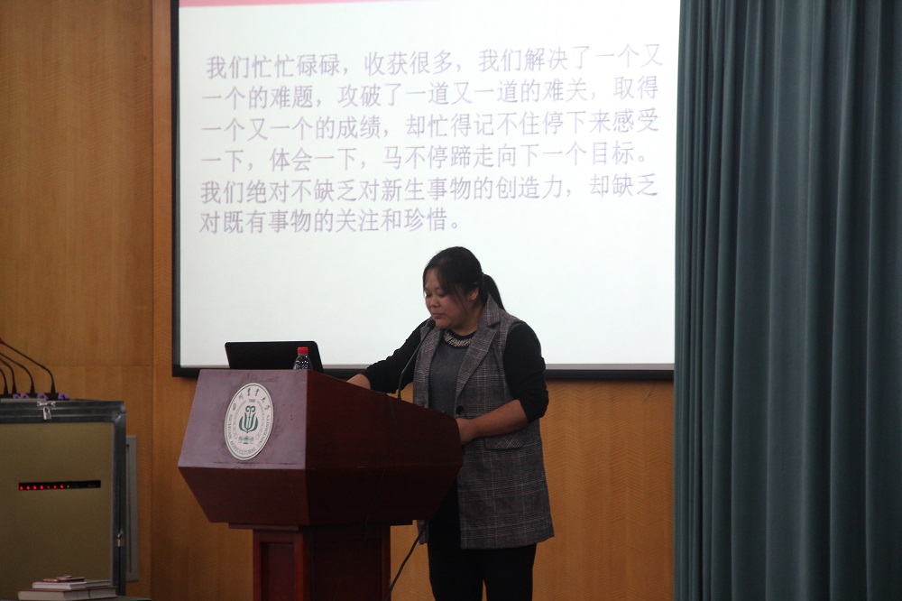 “生而为人,谈着人事,人贵在‘活’。活法不同,根却一致。过‘活’于人,就是一种简单而复杂的一致。”董梅老师用通俗易懂的语言向同学们表达了自己对于“活”的理解。她将自己的家庭教育、专业选择以及如何对文学产生浓厚兴趣的过程进行了简短回忆。从唐诗到宋词,年龄的增长和阅历的积累,董梅老师对于文学的喜欢始终未曾改变。